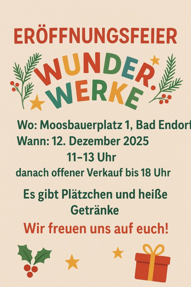 am 12.12.2025 wird offiziell unser Laden am Moosbauerplatz 1 in Bad Endorf eröffnet. Wir bieten von unseren Bewohnern selbst hergestellte Werkstücke aus unseren Sozialtherapeutischen Werkstätten des Ertlhofes in Rimsting, vom Haus Linde in Bad Endorf und des Betreuungszentrums Wernhardsberg / St. Wolfgang an. Bestimmt finden Sie Inspirationen für die Advents- und Weihnachtszeit sowie auch das eine oder andere Geschenk für Ihre Liebsten.